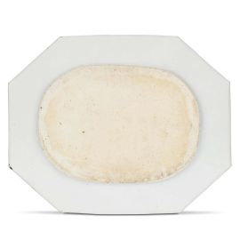 Il grande vassoio ottagonale, cosiddetto “di prima grandezza” ha largo cavetto ovale e tesa breve e orizzontale, il fondo non invetriato. Il decoro mostra al centro una scena orientale di cerimonia del tè: una donna seduta su un tappeto interrompe la sua attività di musicista per porgere una piccola ciotola ad un servitore che sta versando del tè da una teiera di forma allungata, mentre alle sue spalle una servitrice rinfresca la sala agitando un ventaglio. Intorno sui lati corti della tesa due riserve con paesaggi delineati in grisaille, su quello inferiore lo stemma della famiglia Powell con l’arme Cleland (su una fascia di oro e d’argento un leone rampante rosso, con in carico, sul tutto, d’azzurro una lepre saliente argentata con un corno da caccia rossa sopra il collo), su quello superiore è raffigurato il sole sopra le nuvole.