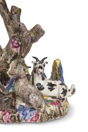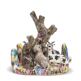 Il gruppo scultoreo in porcellana tenera è modellato con una graziosa scena con tre caprette accucciate sotto un albero spoglio, sul quale è appollaiato un uccellino, il tutto su balze erbose dipinte a colori negli smalti opachi della “famiglia rosa” in contrasto con le scelte cromatiche naturali delle caprette e dell’uccellino. I rami dell’albero sono forati per contenere rami fioriti o bastoncini di incenso per altari personali oppure come elemento decorativo per la tavola in occidente.
