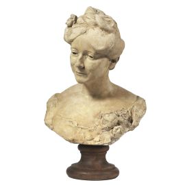 Presentiamo in catalogo il busto in terracotta della violinista torinese Maddalena Maria Teresa -‘Teresina’- Tua (1866-1856), impressionisticamente resa dallo scultore francese Henri Bouchard. Ereditata la passione per la musica dai genitori, Teresina manifesta un precoce talento che le consente di entrare nel 1876 nella classe di violino di Lambert Massart presso il Conservatorio di Parigi, per poi vincere nel 1880 il Grand Prix bandito dallo stesso istituto. La naturale propensione per le esecuzioni virtuosistiche di matrice paganiana, con una spiccata predilezione per la musica di Henryk Wieniawski, conducono la violinista a esibirsi con successo in Europa e Russia, ottenendo la stima e spesso amicizia di compositori e direttori di orchestra, quali Wagner, Liszt, Brahms, Verdi, Wieniawski, Von Bulow, Sgambati o Toscanini e Joachim.