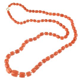 ad un filo di barilotti sfaccettati in corallo digradanti da mm 14x13 a mm 5x5 circa, chiusura a moschettone in oro giallo 18kt, punzone 750, lungh. cm 75, gr. 72