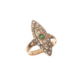 di cui uno in oro a basso titolo, impreziosito da microperle e smeraldo centrale taglio rotondo, mis. 58, accompagnato da un secondo anello in oro e argento impreziosito da onice (difetti) e diamante taglio brillante di ct 0.10 circa, mis. 55, gr. 7