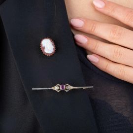 di cui una spilla a barretta in oro giallo e bianco 18kt, recante una pietra semipreziosa centrale affiancata da pietre incolore (difetti), lungh. cm 6,5; uno spillone in oro giallo 18kt con cammeo in calcedonio, lungh. cm 7,5, accompagnato da un pendente in oro giallo 18kt, decorato in smalto blu e perle, dim. cm 2x4,5 circa, gr. 15 complessivi
