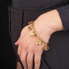 di cui uno in oro giallo e bianco 18kt, realizzato a catena, da cui pendono cinque ciondoli a forma di vagoni di un treno, punzone 750, lungh. cm 18,5, gr. 22, accompagnato da un bracciale in nastro nero, realizzato a cintura, con fibbia in oro 9kt e argento, gr. 2