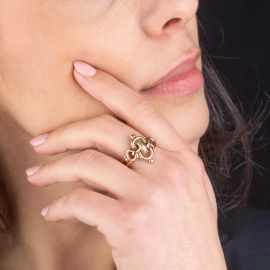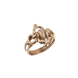 portachiavi in oro 14kt, con due ciondoli di cui uno a forma di chiave e il secondo in madreperla a forma di pesce di lungh. cm 6,5, accompagnato da un anello in oro 9kt raffigurante un motivo a intreccio, mis. 60, gr. 13 complessivi