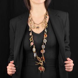 composta da due catene in oro a basso titolo da cui pendono ciondoli in metallo dorato di varie forme e dimensioni impreziositi da pietre dure, lungh. girocollo cm47, lungh. collana cm 64, gr. 321