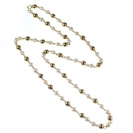ad un filo di perle di mm 7 circa alternate a sfere in oro giallo 18kt, chiusura a moschettone, punzone 750, lungh. cm 79,5, gr. 52