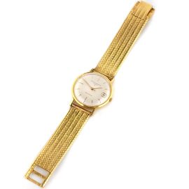 cassa in oro giallo 18kt, fondello integrato, quadrante argenté, grafica nera, indici applicati di colore oro, datario a ore tre, movimento a carica automatica, bracciale a maglia tessita non originale con chiusura a scomparsa, lungh. cm 19, gr. 76, vetro plastica. Diam. mm 34