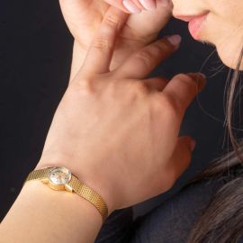 cassa in oro giallo 18kt, fondello a pressione, quadrante argenté, indici applicati, movimento a carica manuale n. 4125, bracciale in oro giallo 18kt a maglia tessita lungh. cm 16, chiusura a scomparsa in oro giallo, vetro minerale, gr. 26. Diam. mm 15