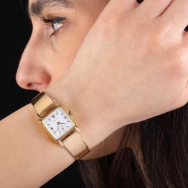 cassa di forma in oro giallo 18kt, fondello a pressione, corona marcata, quadrante argenté, indici e numeri arabi applicati, secondi a ore sei, movimento a carica manuale cal 88 n. 3877729, bracciale rigido in oro giallo 18kt, lungh. interna cm 17 circa, chiusura in oro giallo, vetro minerale, gr. 38. Dim. mm 22x32