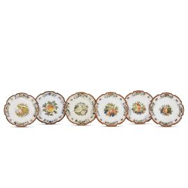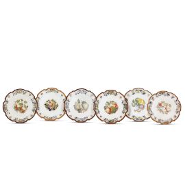 in maiolica dipinta in policromia secondo il decoro “alla frutta barocca”. Composizione: 12 piatti (diam. cm 23,5), 1 piatto da tazza da brodo (diam. cm 23,2), 2 vassoi circolari (diam. cm 33 e cm 29,2),1 vassoio ovale (cm 28,3x33,5), 3 vassoietti ovali (cm 20,6x24)