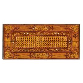 intarsiato in legni vari e madreperla, il piano presenta decoro geometrico entro cornice a racemi a sua volta contornata da cartelle con finali a giglio che contengono motivi floreali, ribalta apribile con movimento del piano e del fronte a finto cassetto celante fascia a linea spezzata con dieci piccoli cassetti sopra piano con intarsio tripartito in tre cartelle che ritorna anche nella parte sottostante del piano superiore; il fonte presenta tre cassetti profilati da riserva in legno ebanizzato intarsiati con analoghe riserve geometriche e intarsio a motivi floreali e madreperla con bocchette e maniglie ellittiche con mascherone in bronzo dorato, i fianchi impreziositi da riserve con tarsia raffigurante pappagallo, la base modanata ed ebanizzata riposa su quattro piedi a cipolla; cm 106,5x140x 69,5