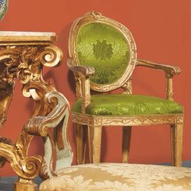 in legno intagliato e dorato, lo schienale a medaglione presenta piccolo decoro superiore fogliaceo lavorato a giorno ed è rivestito di damaschino verde entro fascia decorata a racemi su sostegni posteriori brevi a volute e rosetta, braccioli di linea mossa desinenti a voluta su sotegni poligonali terminanti in seduta rivestita da identico tessuto verde, sottesa da fscia decorata a racemi su gambe troncopiramidali; cm 109x65x53