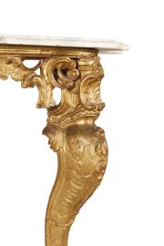 in legno intagliato e dorato, il piano in marmo bianco di linea mossa è sotteso da pendaglina con decoro rocaille a giorno affiancato da gambe riccamente intagliate con ginocchio prominente e andamento a voluta, terminanti in piede a cipolla; cm 88,5x161x70