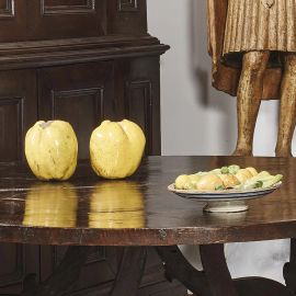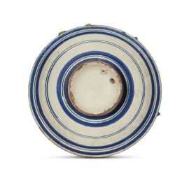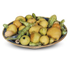 in maiolica dipointa in policromia, corpo emisferico su alto piede circolare. Sul piatto, dipinto nin blu con trattini obliqui a risparmio in prossimità dell'orlo, son applicati frutti, ortaggi, frutta secca e beccelli di legumi, tutti realisticamente resi anche grazie al sapiente uso della policromia; il retro, interamente smaltato, presenta una serie di fasce concentriche di diversa larghezza dipunte in blu sullo smalto bianco; diam. cm 21, diiam. piede cm 8,8. alt. cm 8