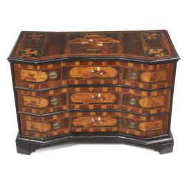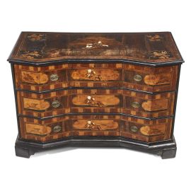 lastronati in legni vari e osso, fronte a linea spezzata rientrante centralmente, piano intarsiato con figura entro cartella centrale e quattro pappagalli entro cartelle mistilinee sugli angoli, sottesa da tre cassetti intervallati da profilature ebanizzate e decorati con intarsio centrale con figure entro cartelle mistilinee e cervi e conigli entro cartelle laterali, maniglie a mezzaluna con decoro a cesto di frutta, base con piedi a mensola; cm 99x145,5x71,5