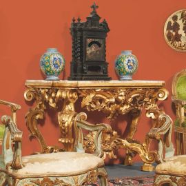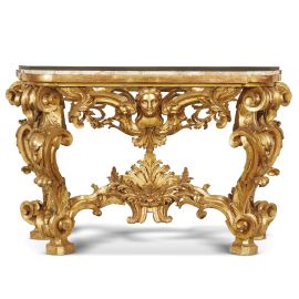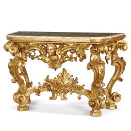 in legno intagliato e dorato, piano in marmo cipollino di forma sagomata, intaglio centrale raffigurante volto femminile, gambe riccamente intagliate a doppia voluta riunite da traversa a crociera che culmina ad elemento in foggia di animale fantastico contornato da elementi fogliacei; cm 94x145x67