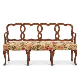 schienale lavorato a giorno con cartelle verticali lavorate a motivi di volute intrecciate, seduta rivestita in velluto a motivi floreali, i braccioli e sostegni di linea mossa, così come le gambe impreziosite da ginocchio pronunciato con piccole volute e terminanti a ricciolo; cm 85,5x156x52