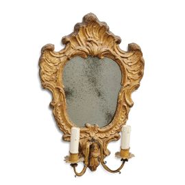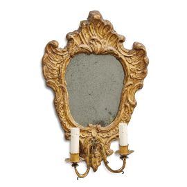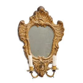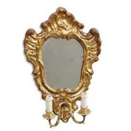 in papier maché, di forma a cartouche con specchio, sotto al quale si dipartono due bracci; montate ad elettricità; cm 59x34x14,5