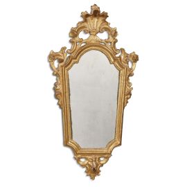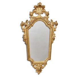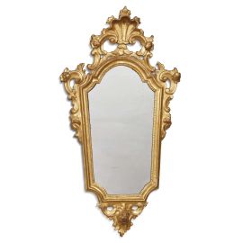 in legno intagliato e dorato, cimasa di forma rocaille lavorata a giorno in foggia di conchiglia sormontante fiore, con decoro a doppia voluta sui fianchi della cornice di linea spezzata a più ordini di gole e battuta con decorata a treccia, terminante in mascherone dotato di attacco per reggi candela; cm 78x42,5
