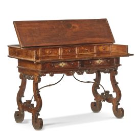 in noce e radica di noce con piano aggettante apribile celante cinque cassetti, sottofascia a doppio cassetto poggiante su gambe a lira riunite da traversa a doppia voluta; cm 95x136,5x68,5