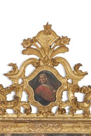 in legno intagliato e dorato, presenta grande cimasa con tela entro cornice raffigurante gentiluomo con cartiglio in mano, entro ricco decoro rocaille lavorato a giorno con fiori e volute che scende lungo i fianchi; la cornice presenta profilatura decorata con fiorellini intervallati da riserve rilevate; cm 171x118,5