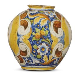 in maiolica decorata in policromia, corpo globulare e orlo gittato, superficie interamente decorata con tratti sinuosi di volute fogliate con grandi foglie crestate, fiori polipetali e campanule, intervallati da due grandi medaglioni con cornice a cartouche centrati da altrettanti ritratti femminili delineati con grande leggerezza, con lumeggiature e ombreggiature in rosso ferraccia: un ritratto è collocato di profilo e l’altro di fronte. Reca sul fondo la sigla in verde C23 e altro numero in smalto bianco; alt. cm 27,5, diam. bocca cm 12,3, diam. base cm 14,8