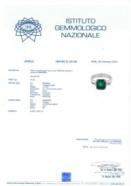 in platino e oro giallo 18kt, impreziosito al centro da uno smeraldo colombiano taglio ottagonale di ct 4.32, affiancato da due diamanti taglio tapes per ct 0.85 circa, colore G/H, purezza Vs, punzoni 950 e del fabbricante, mis. 56, gr. 10. Corredato di certificato IGN del 08/02/2023 attestante le caratteristiche e l'origine geografica della pietra.