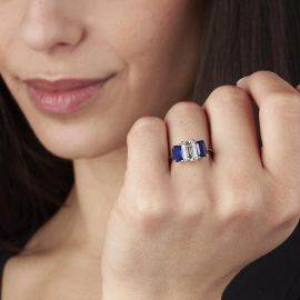 SAPPHIRE AND DIAMOND TRILOGY RING IN 18KT WHITE GOLD