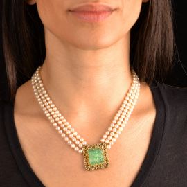 in oro giallo 18kt, composta da tre fili di perle di mm 5 circa, con al centro un pendente di forma quadrata in oro giallo cesellato impreziosito da zaffiri taglio cabochon e uno smeraldo con motivo floreale inciso, firmata “M.Buccellati”, chiusura a moschettone, lungh. cm 43, gr. 61. Corredata di astuccio.