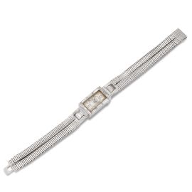 cassa in platino, fondello serrato con viti, lunetta e anse impreziosite da diamanti taglio baguette, quadrante bianco (difetti), numeri arabi stampati, movimento carica manuale, bracciale in platino a due fili, lungh. cm 16, punzoni francesi, vetro minerale, gr. 63. Dim. mm 12x20