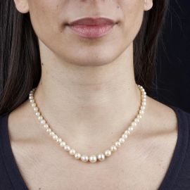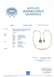 ad un filo di perle naturali digradanti di mm 8.95/4.80 circa, fermatura in oro e argento a forma di fiore con perla centrale di mm 7.40/7.50 circa e corolla di diamanti taglio vecchio e a rosa per ct 1.30 circa, lungh. cm 41, gr. 23. Corredata di certificato IGN del 23/03/2023 attestante le caratteristiche.