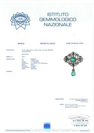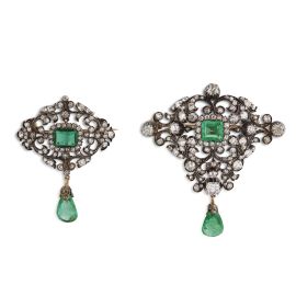 in oro 14kt e argento, composta da: un paio di orecchini pendenti impreziositi da uno smeraldo taglio cuscino di ct 3.10 circa e un secondo smeraldo taglio cuscino di ct 3.20 circa, accompagnati da rose di diamante, chiusura a vite, dim. cm 2,5x7 circa; una spilla a forma di tralci con al centro uno smeraldo taglio cuscino di ct 1.60 circa e diamanti taglio vecchio per ct 1.10 circa, dim. cm 4x5 circa; una seconda spilla con tralci, impreziosita da uno smeraldo centrale taglio cuscino di ct 1.60 circa e diamanti taglio vecchio per ct 6 circa, da cui pende una goccia di smeraldo, dim. cm 5,5x6 circa, gr. 65 complessivi. Corredati di certificati IGN del 8/03/2023 attestanti le caratteristiche e l'origine geografica degli smeraldi.