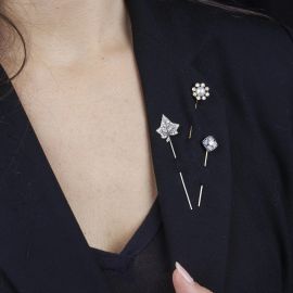 di cui uno in oro bianco 18kt raffigurante sulla sommità una foglia impreziosita da diamanti taglio vecchio 0.30 circa, lungh. cm 7,5, un secondo spillo con parte sommitale a forma di rombo con zaffiri calibrati e diamanti taglio vecchio e a rosa per ct 0.20 circa, lungh. cm 6,5, accompagnato da una terza spilla in oro e argento con un fiore composto da una perla centrale semisferica di mm 5 circa circondata da una corolla di diamanti taglio vecchio per ct 0.40 circa, lungh. cm 6, gr. 6 complessivi