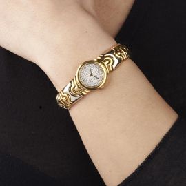 cassa in oro giallo 18kt, fondello serrato a pressione, quadrante con pavé di diamanti, movimento al quarzo ETA n. 978.002, bracciale a molla ad elementi geometrici in oro giallo e bianco 18kt, lungh. interna cm 17, chiusura a scomparsa, punzone 750, vetro minerale, gr. 71. Diam. mm 22