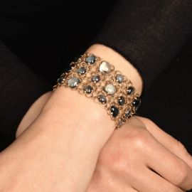 in oro giallo 18kt, realizzato ad ampia fascia composta da maglie a catena, impreziosito da quarzi blu taglio cabochon, firmato "Pomellato", punzoni 750 e del fabbricante, dim. cm 20x3,5, gr. 44