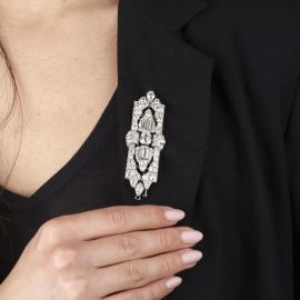 in platino, impreziosita da diamanti taglio vecchio e baguette per ct 11 circa, con al centro un diamante taglio ottagonale di ct 2 circa, dim. cm 7,5x2,5, gr. 30