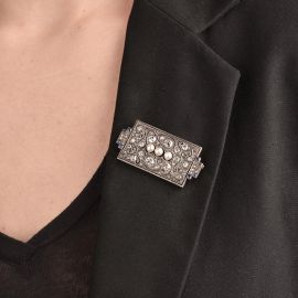 in oro e argento, di forma geometrica con parte rettangolare traforata, impreziosita al centro da tre perle di mm 4 circa circondate da diamanti taglio antico per ct 2.20 circa, affiancati da quattro zaffiri taglio fantasia e rose di diamante, dim. cm 5x2,5, gr. 12
