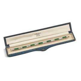 in platino, impreziosito da una fila di diamanti taglio rettangolare per ct 11.80 circa, colore G/H, purezza IF/Vvs, alternati a smeraldi colombiani taglio rettangolare per ct 9.60 circa, firmato "Tiffany & Co", lungh. cm 18,5, gr. 28. Corredato di scatola e certificato IGN del 28/03/2023 attestante le caratteristiche e l'origine geografica degli smeraldi.