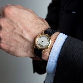 cassa in oro giallo 18kt, fondello a pressione, lunetta liscia in oro giallo 18kt, quadrante argenté, numeri romani, lancette breguet, movimento a carica manuale cal 818/4, cinturino non originale in pelle nera lucida, fibbia in oro giallo 18kt non originale, vetro minerale, gr. 37. Diam. mm 31. Corredato di garanzia.