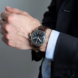 cassa in acciaio, fondello serrato a vite, tasti a pompa, quadrante antracite, grafica bianca, numeri arabi luminescenti, movimento a carica manuale cal Valjoux 222, cinturino in pelle marrone, fibbia in acciaio, vetro plastica. Diam. mm 38