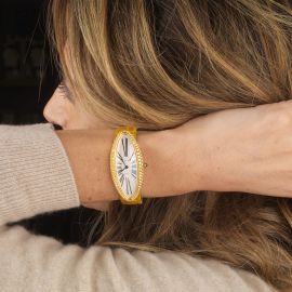 cassa in oro giallo 18kt, fondello serrato con viti firmato Cartier, lunetta impreziosita con due file di diamanti fancy applicati successivamente, corona con zaffiro cabochon, quadrante guilloché firmato Cartier Paris, numeri romani, movimento a carica manuale, cinturino in pelle ocra, lungh. interna cm 14, fibbia deployant firmata Cartier in oro giallo 18kt, vetro minerale, gr. complessivi 47. Diam. mm 24x53