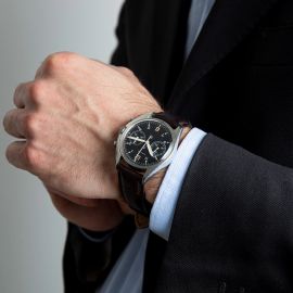 cassa in acciaio, fondello serrato a vite, tasti del crono a pompa, ghiera liscia, quadrante nero, grafica bianca, indici e numeri arabi al trizio, contatore dei secondi a ore nove, contatore dei minuti a ore tre, movimento a carica manuale cal Valjoux 7733, cinturino non originale in pelle testa di moro, fibbia in acciaio, vetro plastica. Diam. mm 37