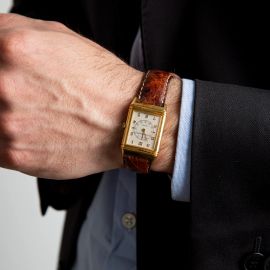 cassa di forma rettangolare in oro giallo 18kt con sistema a scorrimento e alloggio in oro giallo, fondello recante personalizzazione in lettere "G.R.", quadrante argenté, grafica di colore nero, numeri arabi applicati, movimento a carica manuale, cinturino originale in pelle marrone, fibbia deployant in oro giallo 18kt marcata Jaeger LeCoultre, vetro minerale, gr. 55. Dim. mm 28x33