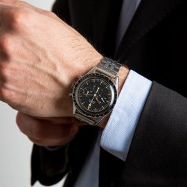 cassa in acciaio, fondello a vite con logo Speedmaster e coperchio antipolvere, tasti a pompa, corona marcata, ghiera con inserto nero e scala tachimetrica, quadrante nero, grafica bianca, contatore dei secondi a ore nove, contatore dei minuti a ore tre, contatore delle ore alle sei, movimento a carica manuale cal 321 n. 17762750, bracciale a maglie in acciaio non originale con chiusura deployant a scomparsa, lungh. interna cm 20, vetro plastica. Diam. mm 42