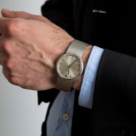 cassa in oro bianco 18kt, fondello a vite, quadrante argenté, indici applicati, rimessa dell'ora posta sul fondello, movimento a carica automatica, bracciale integrato a maglia tessita in oro bianco 18kt, chiusura a scomparsa in oro bianco 18kt marcata Patek Philippe, vetro minerale, gr. 100. Diam. mm 34. Corredato di scatola.