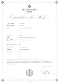 cassa monoblocco in oro giallo 18kt, lunetta liscia in oro giallo, quadrante sigma ardesia, grafica bianca, indici applicati oro, datario a ore tre, movimento a carica automatica cal 28-255 C n. 1304374, bracciale a maglie in oro giallo 18kt, lungh. interna cm 20, chiusura deployant a scomparsa marcata Patek Philippe, vetro minerale. Diam. mm 42