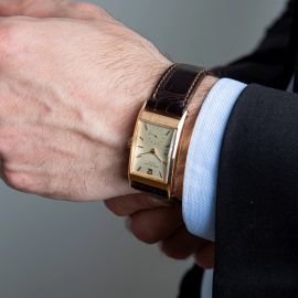 cassa di forma in oro rosa 18kt, fondello a pressione, quadrante argenté, grafica nera, indici applicati, secondi a ore sei, movimento a carica manuale n. 977921, cinturino originale in pelle marrone, fibbia non marcata in oro rosa 18kt, vetro minerale, gr. 38. Dim. mm 22x42. Corredato di scatola, garanzia di riparazione e di estratto di archivio.