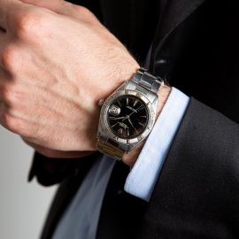 cassa in acciaio, fondello serrato a vite, ghiera bidirezionale con indici e numeri arabi, corona marcata, quadrante nero, grafica oro, indici applicati, datario a ore tre, movimento a carica automatica cal 1560, bracciale oyster a maglie rivettate ref. 7206 finali 80, lungh. interna cm 19, cod. produzione 4.65, chiusura a scatoletta marcata Rolex, vetro plastica. Diam. mm 37