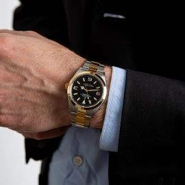 cassa in acciaio, fondello a vite, lunetta in oro giallo, corona marcata, quadrante nero, grafica bianca, indici e numeri arabi applicati al superluminova, movimento a carica automatica cal 3230 n. 1TD04962, bracciale oyster in acciaio e oro a maglie piene ref. 78GA03 finali 9AD, lungh. interna cm 19 circa, chiusura deployant a scomparsa marcata Rolex, vetro minerale, gr. 123. Diam. mm 36. Corredato di scatola, garanzia e due maglie aggiuntive.