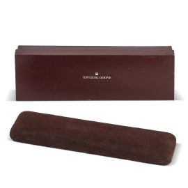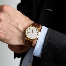 cassa in oro giallo 18kt, fondello a pressione, corona marcata, quadrante argenté, grafica nera, numeri romani a smalto, movimento a carica automatica con microrotore cal 66, cinturino originale in pelle marrone, fibbia placcata in oro marcata Universal Geneve, vetro plastica, gr. 30. Diam. mm 34. Corredato di scatola.